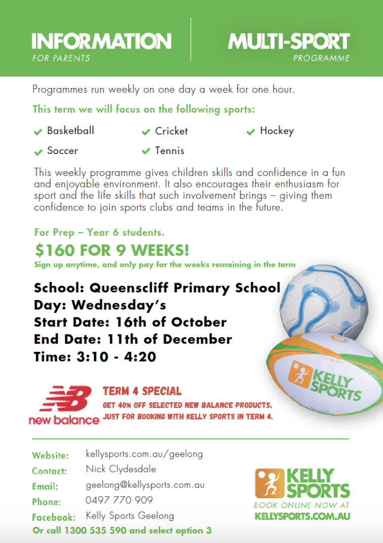 Last week, our Kelly Sports Club commenced on Wednesday 16 October. We have over 30 students involved in the program. Kelly Sports Club commences at 3:10pm and concludes at 4:20pm. Students will have the opportunity to learn new skills and engage in a variety of sports in a fun, supportive environment. They will learn key skills for basketball, cricket, hockey, soccer and tennis throughout the term. If you wish to sign your child up to Kelly Sports Club for Term 4, please email Kelly Sports at geelong@kellysports.com.au .