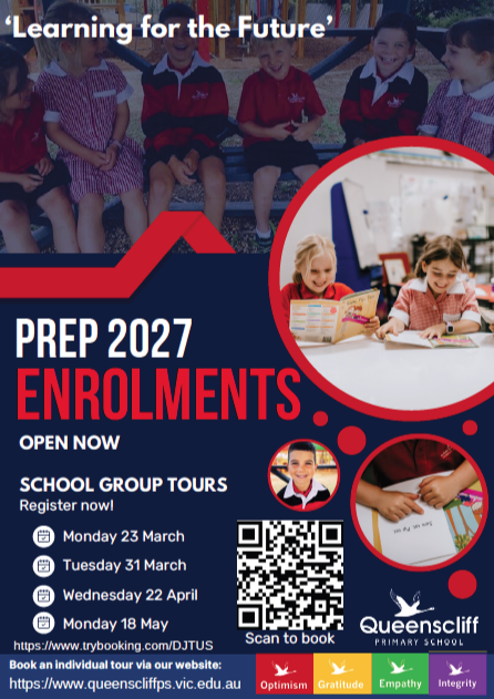We are grateful to the many families who have already joined us for school tours, and we look forward to meeting more throughout Term 2. If you know families considering QPS for Prep in 2027, school tours can be easily booked using the QR code provided below. Further information regarding Enrolment processes can be accessed at Enrolment Information - Queenscliff Primary School
